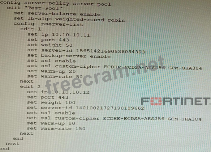 what the heck ->. The Server Pool in the exhibit is configured with a weight of 20 for server 1 and a weight of 60 for server 2 Where do you see this. Can you NOT read the configuration. It clearly has a weight of 50 and 100 for servers 1 and 2 respectively.