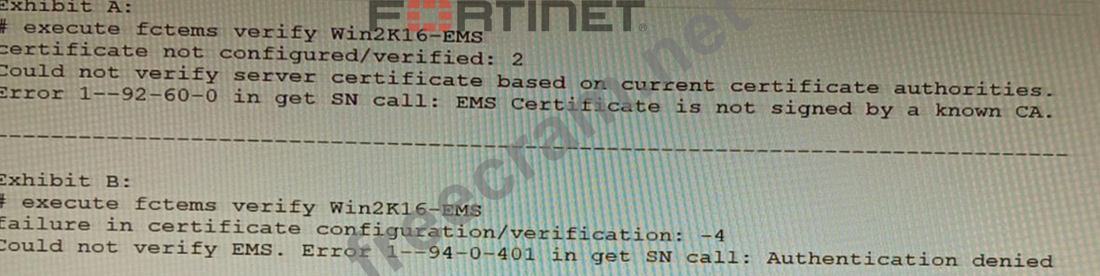 A is correct because the error message "The CRL is not accessible" indicates that the root FortiGate cannot access the CRL for the FortiClient EMS server. Verifying that the CRL is accessible will fix this error. D is correct because the error message "The FortiClient EMS server is not authorized" indicates that the root FortiGate is not authorized to connect to the FortiClient EMS server. Authorizing the root FortiGate on the FortiClient EMS server will fix this error. The other options are incorrect. Option B is incorrect because exporting and importing the FortiClient EMS server certificate to the root FortiGate will not fix the CRL error. Option C is incorrect because installing a new known CA on the Win2K16-EMS server will not fix the authorization error. References: Troubleshooting FortiClient EMS connectivity | FortiClient / FortiOS 7.0.0 - Fortinet Document Library Authorizing FortiGates with FortiClient EMS | FortiClient / FortiOS 6.4.8 - Fortinet Document Library