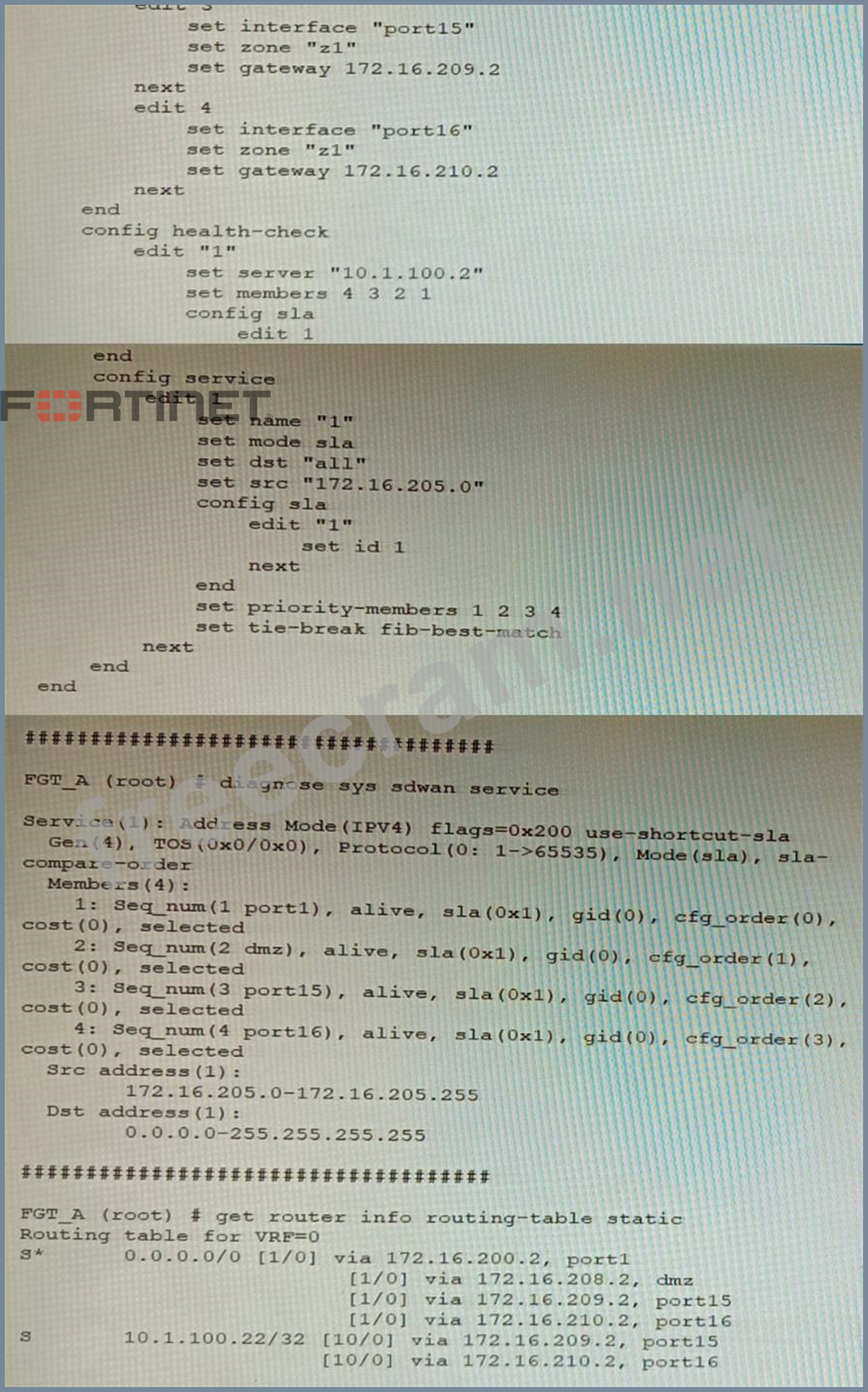 Refer to the exhibit showing an SD-WAN configuration. According to the exhibit, if an internal user pings 10.1.100.2 and 10.1.100.22 from subnet 172.16.205.0/24, which outgoing interfaces will be used?