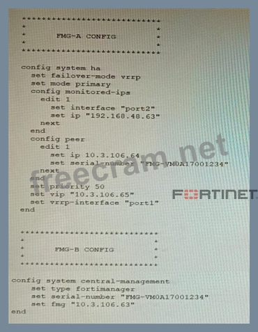 Refer to the exhibit showing FortiGate configurations FortiManager VM high availability (HA) is not functioning as expected after being added to an existing deployment. The administrator finds that VRRP HA mode is selected, but primary and secondary roles are greyed out in the GUI The managed devices never show online when FMG-B becomes primary, but they will show online whenever the FMG-A becomes primary. What change will correct HA functionality in this scenario?