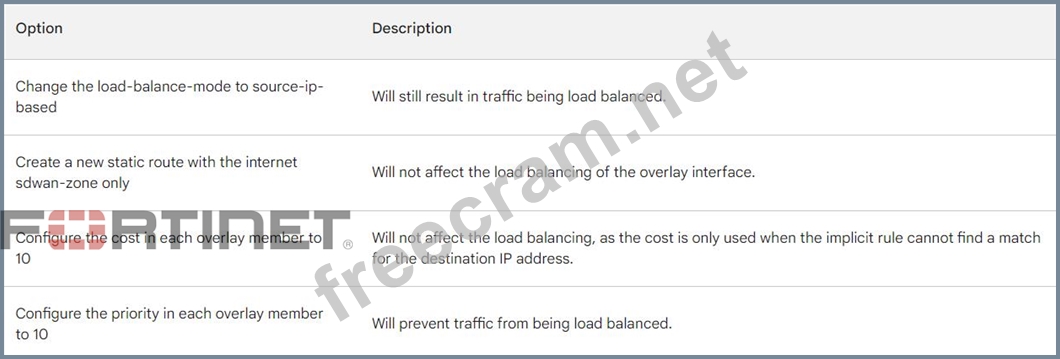 The default load balancing mode for the SD-WAN implicit rule is source IP based. This means that traffic will be load balanced evenly between the overlay members, regardless of the member's priority. To prevent traffic from being load balanced, you can configure the priority of each overlay member to 10. This will make the member ineligible for load balancing. The other options are not correct. Changing the load balancing mode to source-IP based will still result in traffic being load balanced. Creating a new static route with the internet sdwan-zone only will not affect the load balancing of the overlay interface. Configuring the cost in each overlay member to 10 will also not affect the load balancing, as the cost is only used when the implicit rule cannot find a match for the destination IP address.