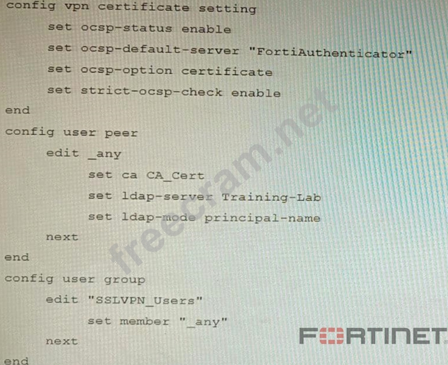 An administrator has configured a FortiGate device to authenticate SSL VPN users using digital certificates. A FortiAuthenticator is the certificate authority (CA) and the Online Certificate Status Protocol (OCSP) server. Part of the FortiGate configuration is shown below: Based on this configuration, which two statements are true? (Choose two.)