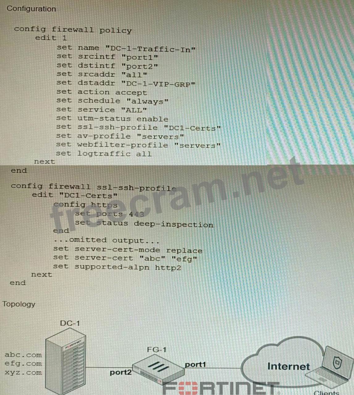 Refer to the exhibits, which show a firewall policy configuration and a network topology. An administrator has configured an inbound SSL inspection profile on a FortiGate device (FG-1) that is protecting a data center hosting multiple web pages-Given the scenario shown in the exhibits, which certificate will FortiGate use to handle requests to xyz.com?