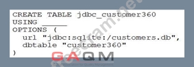 A data engineer needs to create a table in Databricks using data from their organization's existing SQLite database. They run the following command: Which of the following lines of code fills in the above blank to successfully complete the task?
