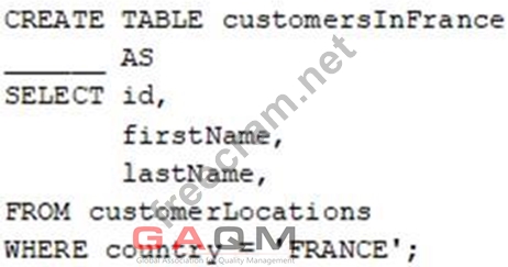 A data engineer wants to create a new table containing the names of customers that live in France. They have written the following command: A senior data engineer mentions that it is organization policy to include a table property indicating that the new table includes personally identifiable information (PII). Which of the following lines of code fills in the above blank to successfully complete the task?