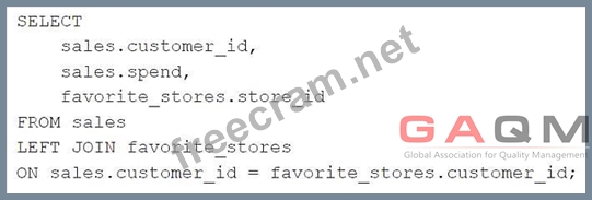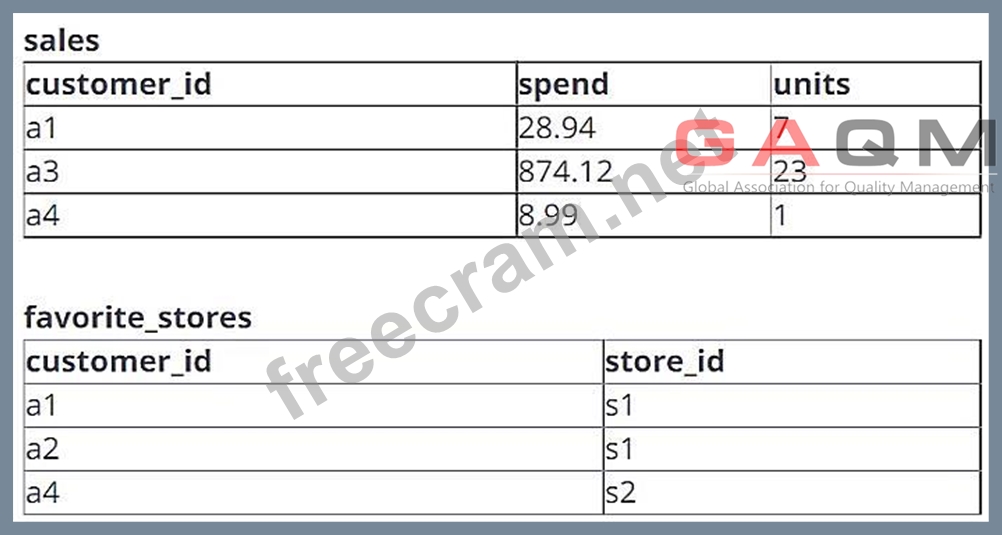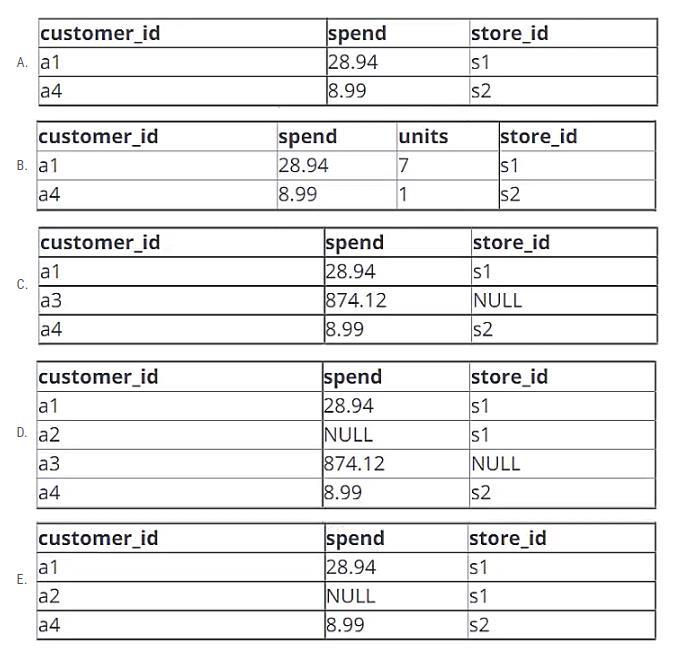 A data engineer is working with two tables. Each of these tables is displayed below in its entirety. The data engineer runs the following query to join these tables together: Which of the following will be returned by the above query?