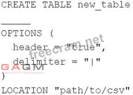 A data engineer needs to create a table in Databricks using data from a CSV file at location /path/to/csv. They run the following command: Which of the following lines of code fills in the above blank to successfully complete the task?