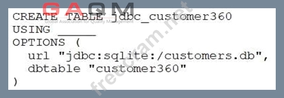 A data engineer needs to create a table in Databricks using data from their organization's existing SQLite database. They run the following command: Which of the following lines of code fills in the above blank to successfully complete the task?