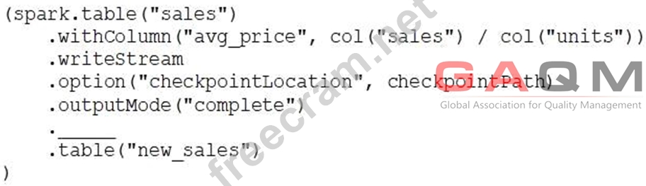 A data engineer has configured a Structured Streaming job to read from a table, manipulate the data, and then perform a streaming write into a new table. The cade block used by the data engineer is below: If the data engineer only wants the query to execute a micro-batch to process data every 5 seconds, which of the following lines of code should the data engineer use to fill in the blank?