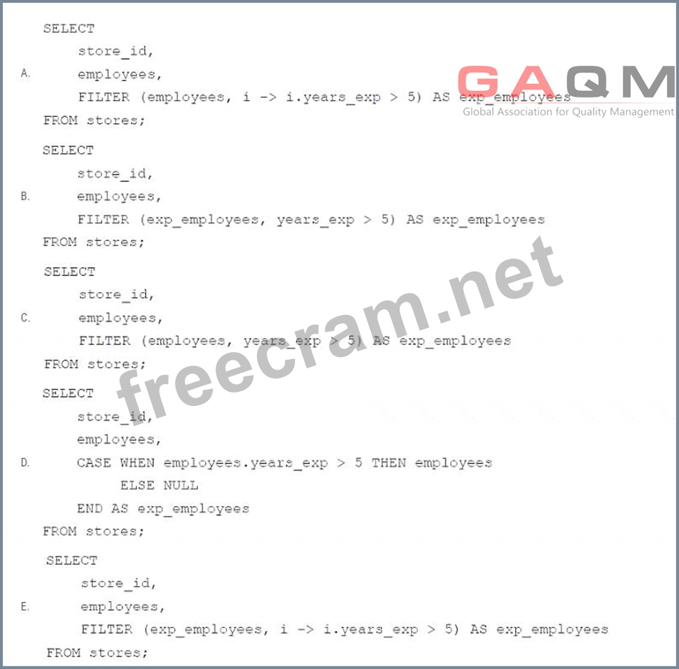 A data engineer needs to apply custom logic to identify employees with more than 5 years of experience in array column employees in table stores. The custom logic should create a new column exp_employees that is an array of all of the employees with more than 5 years of experience for each row. In order to apply this custom logic at scale, the data engineer wants to use the FILTER higher-order function. Which of the following code blocks successfully completes this task?