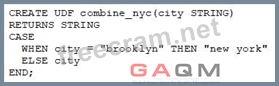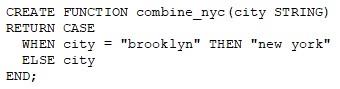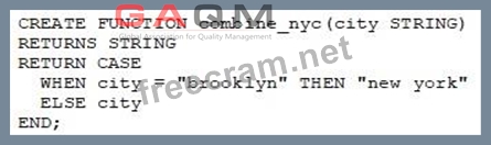 A data engineer needs to apply custom logic to string column city in table stores for a specific use case. In order to apply this custom logic at scale, the data engineer wants to create a SQL user-defined function (UDF).