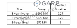 * Calculate the weighted average of modified durations: * The modified duration of the portfolio is a weighted average of the durations of the individual bonds, where the weights are the proportions of the total portfolio value. * Calculate the total value of the portfolio: $200 MM (3-year floater) + $120 MM (5-year floater) + $50 MM (10-year fixed) = $370 MM. * Calculate the weights for each bond: * 3-year floater: $200 MM / $370 MM = 0.5405 * 5-year floater: $120 MM / $370 MM = 0.3243 * 10-year fixed: $50 MM / $370 MM = 0.1351 * Multiply each bond's weight by its modified duration and sum the results: * (0.5405 * 0.25) + (0.3243 * 0.25) + (0.1351 * 8) = 0.1351 + 0.0811 + 1.081 = 1.297 * Therefore, the weighted average modified duration is approximately 1.30. References Calculation based on standard formula and weights derived from the table.