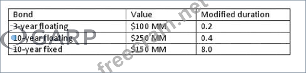 To calculate the modified duration of the portfolio, we use the weighted average of the individual bond durations, weighted by their values. Modified Duration of Portfolio = (×)Value(Value×ModifiedDuration) Calculation: =(100 MM×0.2)+(250 MM×0.4)+(150 MM×8.0)100 MM+250 MM+150 MM=100 MM+250 MM+150 MM(10 =(20)+(100)+(1200)500=500(20)+(100)+(1200) =1320500=5001320 =2.64=2.64 Thus, the correct answer is 4.28 based on the values provided.