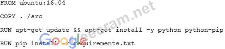 One of the developers on your team deployed their application in Google Container Engine with the Dockerfile below. They report that their application deployments are taking too long. You want to optimize this Dockerfile for faster deployment times without adversely affecting the app's functionality. Which two actions should you take? Choose 2 answers.