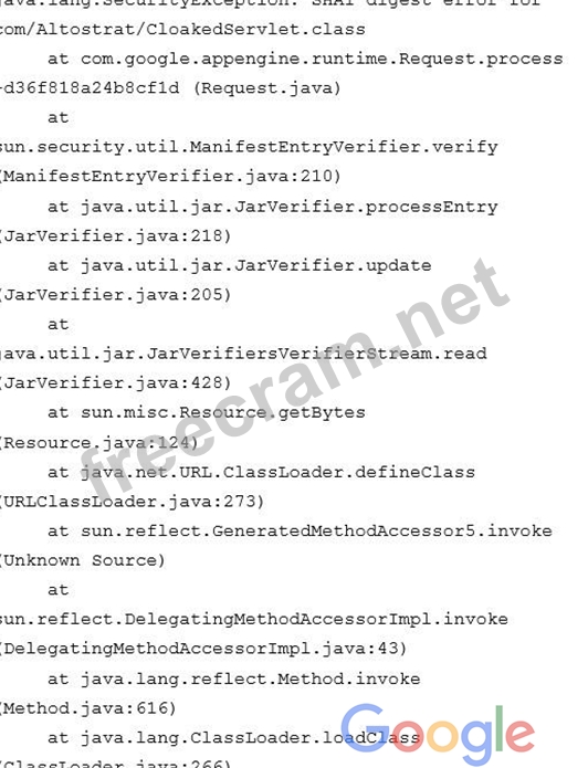You deploy your custom Java application to Google App Engine. It fails to deploy and gives you the following stack trace.