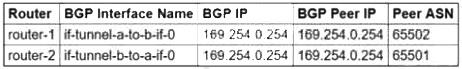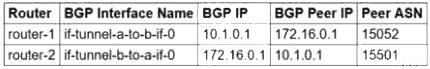 You need to configure the Border Gateway Protocol (BGP) session for a VPN tunnel you just created between two Google Cloud VPCs, 10.1.0.0/16 and 172.16.0.0/16. You have a Cloud Router (router-1) in the 10.1.0.0/16 network and a second Cloud Router (router-2) in the 172.16.0.0/16 network. Which configuration should you use for the BGP session?