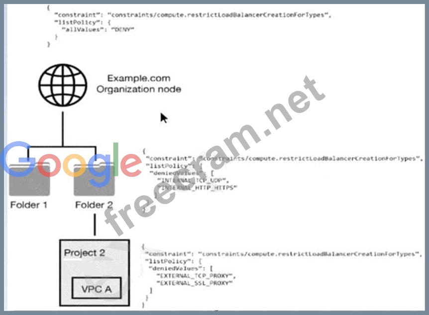 * The provided resource hierarchy has an organization node (Example.com), folders (Folder 1 and Folder 2), and a project (Project 2) under Folder 2 with a specific VPC (VPC A).