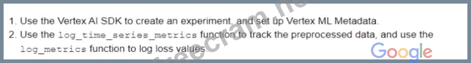 You are developing a model to predict whether a failure will occur in a critical machine part. You have a dataset consisting of a multivariate time series and labels indicating whether the machine part failed You recently started experimenting with a few different preprocessing and modeling approaches in a Vertex Al Workbench notebook. You want to log data and track artifacts from each run. How should you set up your experiments?