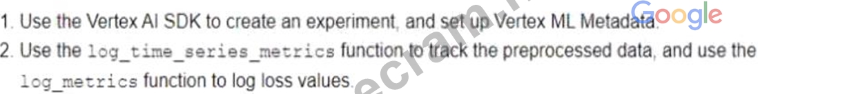 The option A is the most suitable solution for logging data and tracking artifacts from each run of a model development experiment in a Vertex AI Workbench notebook. Vertex AI Workbench is a service that allows you to create and run interactive notebooks on Google Cloud. You can use Vertex AI Workbench to experiment with different preprocessing and modeling approaches for your time series prediction problem.