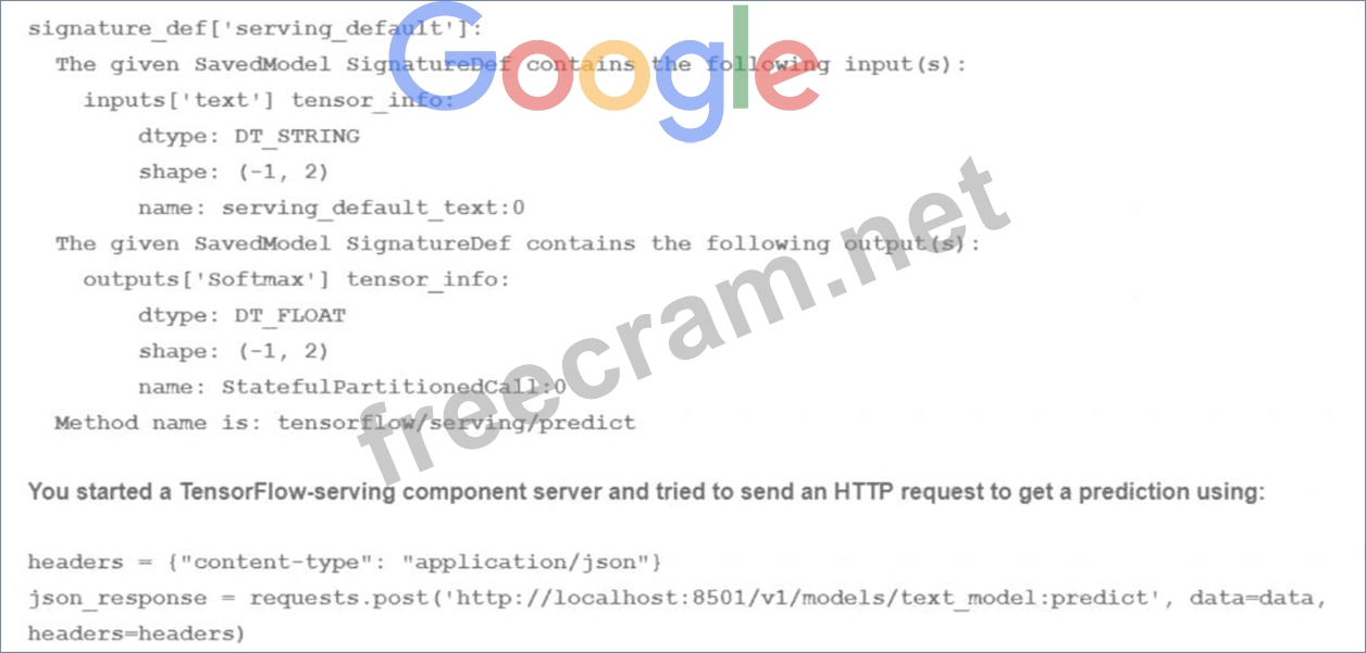 A predict request is a way to send data to a trained model and get predictions in return. A predict request can be written in different formats, such as JSON, protobuf, or gRPC, depending on the service and the platform that are used to host and serve the model. A predict request usually contains the following information: * The signature name: This is the name of the signature that defines the inputs and outputs of the model. A signature is a way to specify the expected format, type, and shape of the data that the model can accept and produce. A signature can be specified when exporting or saving the model, or it can be automatically inferred by the service or the platform. A model can have multiple signatures, but only one can be used for each predict request. * The instances: This is the data that is sent to the model for prediction. The instances can be a single instance or a batch of instances, depending on the size and shape of the data. The instances should match the input specification of the signature, such as the number, name, and type of the input tensors. For the use case of training a text classification model, the correct way to write the predict request is D. data = json.dumps({"signature_name": "serving_default", "instances": [['a', 'b'], ['c', 'd'], ['e', 'f']]}) This option involves writing the predict request in JSON format, which is a common and convenient format for sending and receiving data over the web. JSON stands for JavaScript Object Notation, and it is a way to represent data as a collection of name-value pairs or an ordered list of values. JSON can be easily converted to and from Python objects using the json module. This option also involves using the signature name "serving_default", which is the default signature name that is assigned to the model when it is saved or exported without specifying a custom signature name. The serving_default signature defines the input and output tensors of the model based on the SignatureDef that is shown in the image. According to the SignatureDef, the model expects an input tensor called "text" that has a shape of (-1, 2) and a type of DT_STRING, and produces an output tensor called "softmax" that has a shape of (-1, 2) and a type of DT_FLOAT. The -1 in the shape indicates that the dimension can vary depending on the number of instances, and the 2 indicates that the dimension is fixed at 2. The DT_STRING and DT_FLOAT indicate that the data type is string and float, respectively. This option also involves sending a batch of three instances to the model for prediction. Each instance is a list of two strings, such as ['a', 'b'], ['c', 'd'], or ['e', 'f']. These instances match the input specification of the signature, as they have a shape of (3, 2) and a type of string. The model will process these instances and produce a batch of three predictions, each with a softmax output that has a shape of (1, 2) and a type of float. The softmax output is a probability distribution over the two possible classes that the model can predict, such as positive or negative sentiment. Therefore, writing the predict request as data = json.dumps({"signature_name": "serving_default", "instances": [['a', 'b'], ['c', 'd'], ['e', 'f']]}) is the correct and valid way to send data to the text classification model and get predictions in return. References: * [json - JSON encoder and decoder]