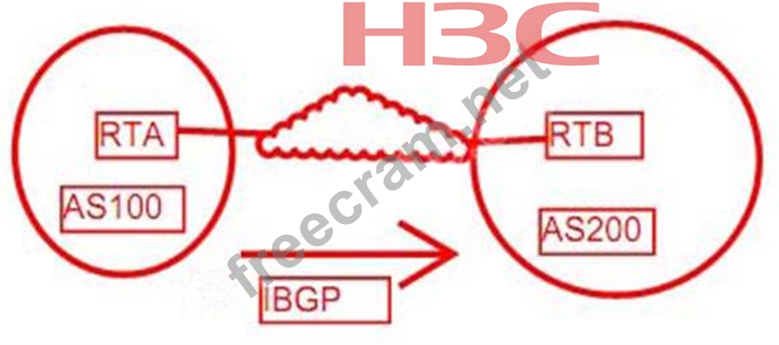RTA and RTB are not directly interconnected and are located in autonomous systems 100 and 200 respectively. The loopback0 address of RTA is 1.1.1.1, and the loopback address of RTB is 0 2.2.2.2.