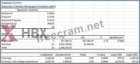 A student wants to analyze the relationship between the percentage of the population in a given city with some college experience and the newspaper circulation in that city. College experience is defined as the percentage of adults in the city that have completed high school and taken some classes at the college level. The appropriate data were collected and a regression analysis was performed, the results of which are displayed below.