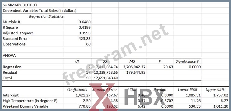 The owner of a small bakery is interested in forecasting the bakery's total sales for a certain date. The owner believes that sales on a given day are influenced by the day's highest temperature (in degrees F) and whether the day falls on a weekend (Saturday or Sunday). A random sample of 60 days is taken from November 2013 to May 2014; the regression results are given below. If the high temperature for tomorrow, a Thursday, is forecasted to be 60 degrees F, what does the model predict the total sales will be?