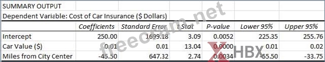 An executive at an insurance company has developed a new method for determining monthly rates for drivers insured by the company. Using a regression analysis of different factors, the executive has come to the conclusion that the two most important factors are the value of the carand the number of miles the driver lives from the city. The partial regression output table provided by the data is as follows: