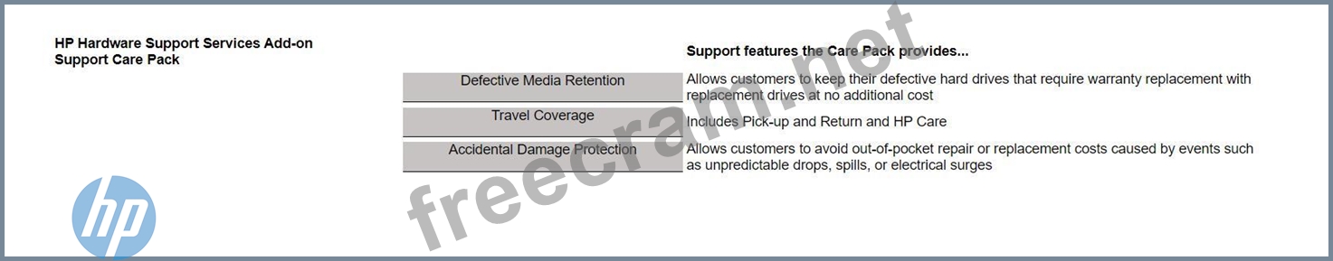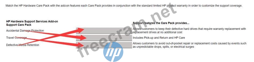 Explanation: A screenshot of a computer Description automatically generated Here is the correct matching of theHP Hardware Support Services Add-on Support Care Packwith the features it provides: * Accidental Damage ProtectionSupport features the Care Pack provides: Allows customers to avoid out-of-pocket repair or replacement costs caused by events such as unpredictable drops, spills, or electrical surges. * Travel CoverageSupport features the Care Pack provides: Includes Pick-up and Return and HP Care. * Defective Media RetentionSupport features the Care Pack provides: Allows customers to keep their defective hard drives that require warranty replacement with replacement drives at no additional cost. These add-on services offer extended protection beyond the basic warranty, helping customers mitigate costs and enhance coverage for specific scenarios