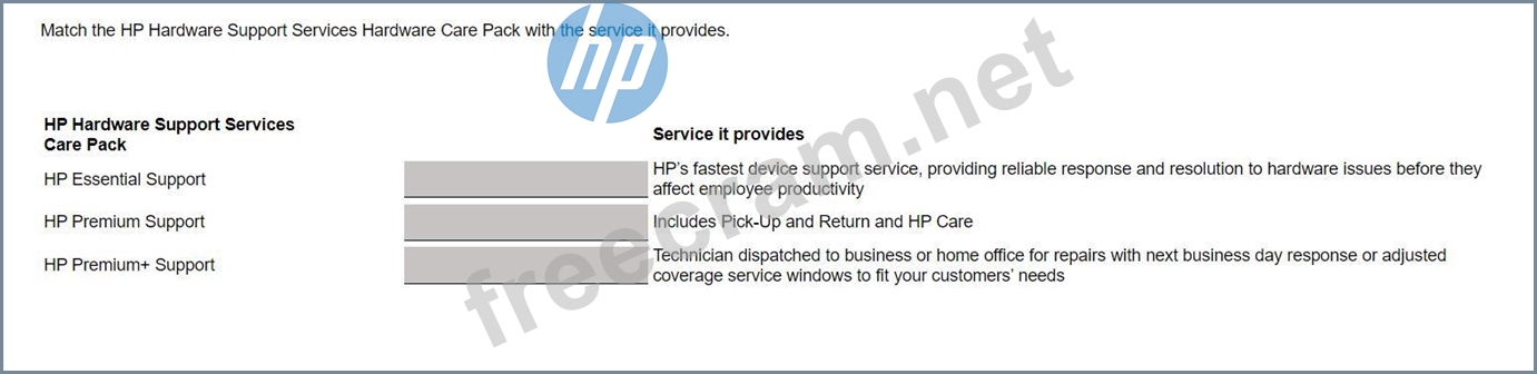 Explanation: A close-up of a list of text Description automatically generated Here is the correct matching of theHP Hardware Support Services Care Packwith the service it provides: * HP Essential SupportService it provides: Includes Pick-Up and Return and HP Care * HP Premium SupportService it provides: Technician dispatched to business or home office for repairs with next business day response or adjusted coverage service windows to fit your customers' needs * HP Premium+ SupportService it provides: HP's fastest device support service, providing reliable response and resolution to hardware issues before they affect employee productivity These support levels offer different tiers of service to meet various customer needs, ranging from basic hardware support to premium services with faster response times and comprehensive coverage