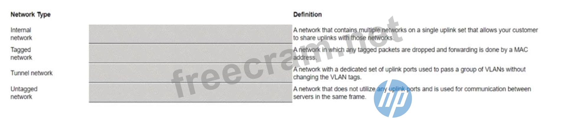 Here are the correct matches for each HPE OneView network type with their respective definitions: