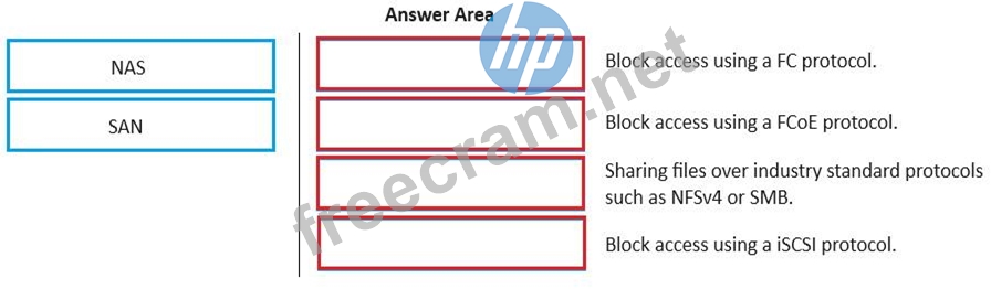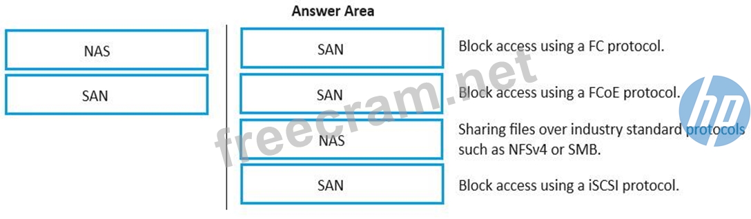 Explanation: According to the HPE website, NAS stands for Network Attached Storage and is a storage system that provides file-level access to data over a network. NAS devices use protocols such as NFSv4 or SMB to share files with clients. NAS devices typically have their own file system and operating system and can support multiple users and applications. SAN stands for Storage Area Network and is a network that provides block-level access to data over a dedicated network. SAN devices use protocols such as FC, FCoE, or iSCSI to transfer blocks of data to servers. SAN devices do not have their own file system and rely on the servers to manage the data. SAN devices typically provide high performance and availability for mission- critical applications.
