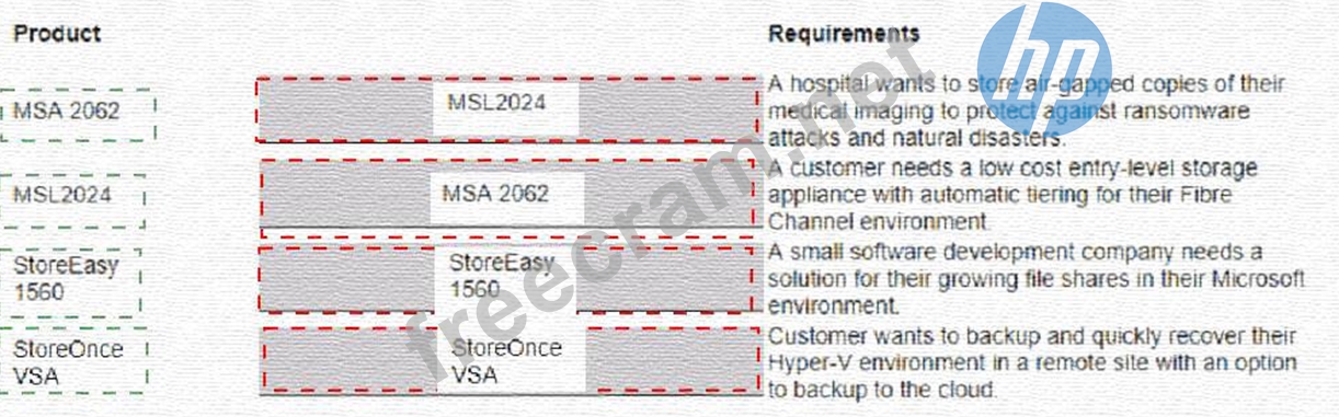 MSA 2062: A customer needs a low cost entry-level storage appliance with automatic tiering for their Fibre Channel environment MSL2024: A hospital wants to store air-gapped copies of their medical imaging to protect against ransomware attacks and natural disasters StoreEasy 1560: A small software development company needs a solution for their growing file shares in their Microsoft environment StoreOnce VSA: Customer wants to backup and quickly recover their Hyper-V environment in a remote site with an option to backup to the cloud This is because: