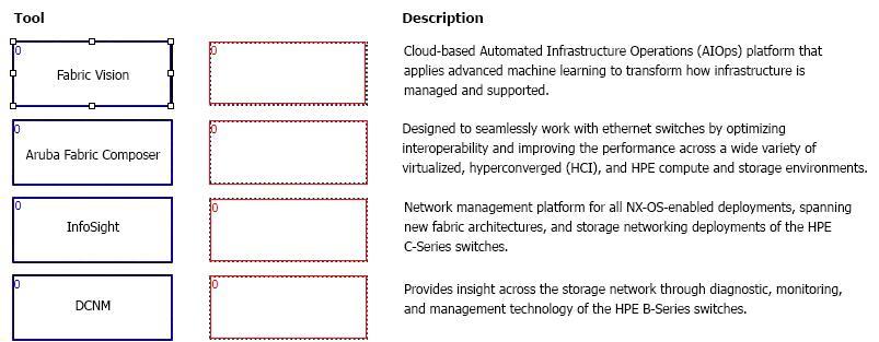 Cloud-based Automated Infrastructure Operations (AIOps) platform that applies advanced machine learning to transform how infrastructure is managed and supported. = InfoSight Designed to seamlessly work with ethernet switches by optimizing interoperability and improving the performance across a wide variety of virtualized, hyperconverged (HCI), and HPE compute and storage environments. = Aruba Fabric Composer Network management platform for all NX-OS-enabled deployments, spanning new fabric architectures, and storage networking deployments of the HPE C-Series switches. = DCNM Provides insight across the storage network through diagnostic, monitoring, and management technology of the HPE B-Series switches. = Fabric Vision InfoSight: InfoSight is a cloud-based Automated Infrastructure Operations (AIOps) platform that applies advanced machine learning to transform how infrastructure is managed and supported. It can monitor and optimize the performance, health, and utilization of HPE's storage, servers, and networking solutions, and provide insights and recommendations to enhance the efficiency and reliability of the infrastructure12.