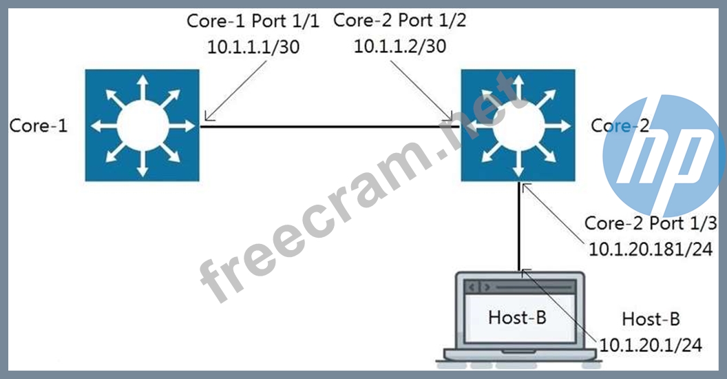 Traffic is failing between Core-1 and Host-B. IP addressing has correctly been applied, and all interfaces are attached to the vrf GREEN.