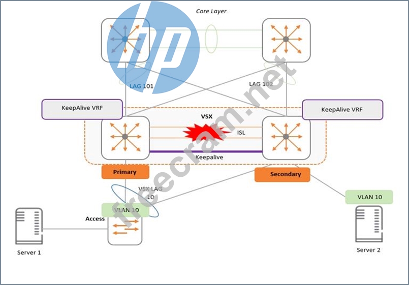 Two AOS-CX switches are configured for VSX at the access layer, where servers attached to them. An SVI interface is configured for VLAN 10 and serves as the default gateway for VLAN 10. The ISL link between the switches fails, but the keepalive interface functions. Active gateway has been configured on the switches.