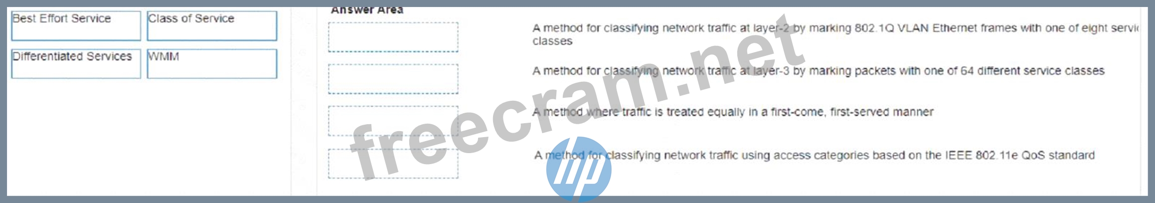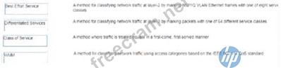 Explanation: QoS concept: Class of Service Definition: 3) A method for classifying network traffic using access categories based on the IEEE 802.11e QoS standards QoS concept: Differentiated services Definition: 2) A method for classifying network traffic at layer-3 or marking packets with one of 64 different service classes QoS concept: WMM Definition: 4) A method for classifying network traffic using access categories based on the IEEE 802.11e QoS standards