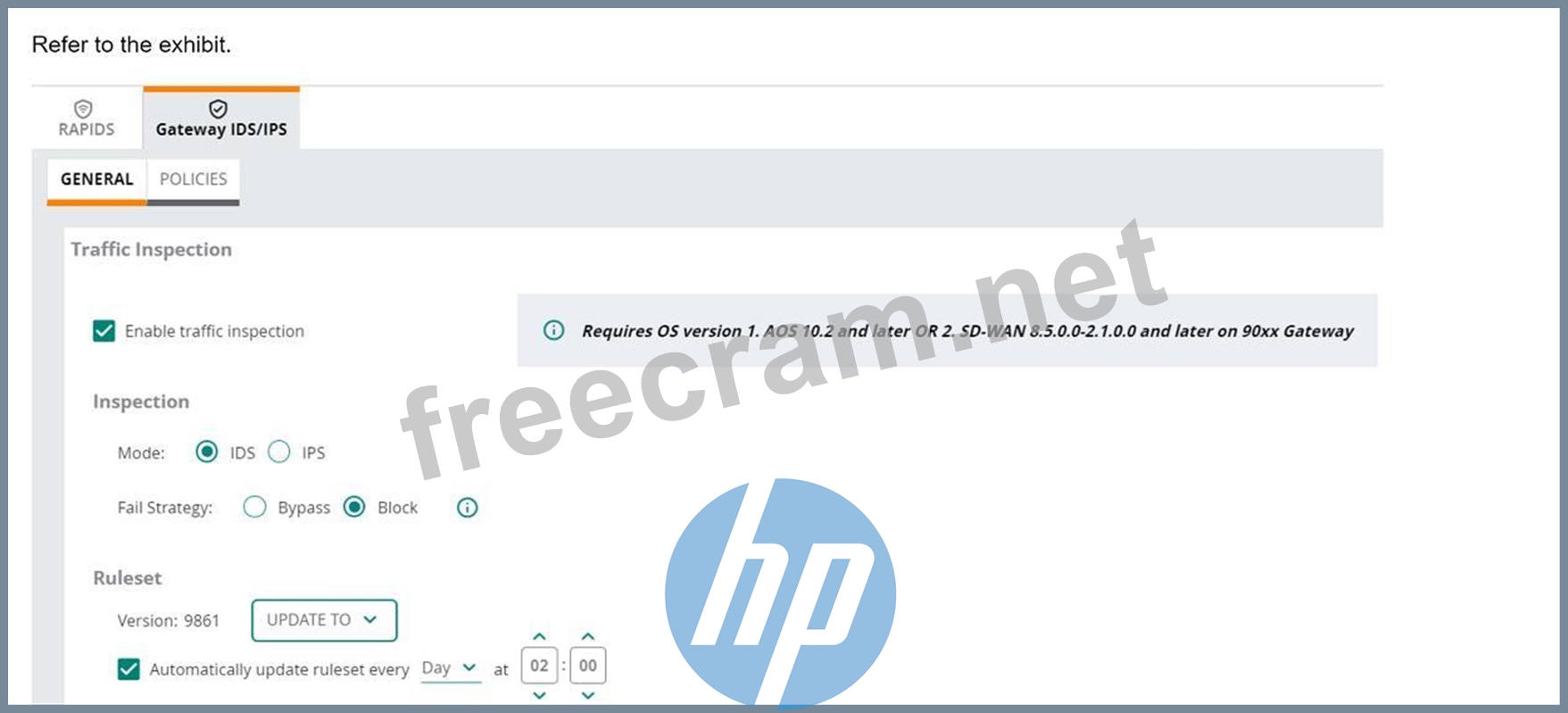 In the exhibit, the HPE Aruba Networking Central settings for the 9x00 gateway show that traffic inspection is enabled, and the gateway is set to operate in IDS (Intrusion Detection System) modewith the fail strategy set to "Block". This configuration means that the gateway will drop traffic if it matches a rule in the active ruleset. 1.Active Ruleset: The ruleset version 9861 is active, and the gateway is configured to automatically update the ruleset daily. 2.Traffic Matching Rules: When traffic matches a rule in the active ruleset, it is flagged as suspicious or malicious. 3.Block Mode: Since the fail strategy is set to "Block", any traffic that matches a rule in the active ruleset will be dropped to prevent potential threats.