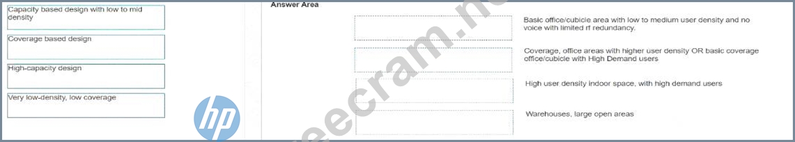 Capacity based design with low to mid density - Basic office/cubicle area with low to medium user density and no voice with limited rf redundancy.Coverage based design - Coverage, office areas with higher user density OR basic coverage office/cubicle with High Demand usersHigh-capacity design - High user density indoor space, with high demand usersVery low-density, low coverage - Warehouses, large open areas The types of wireless network deployment should be matched to the usage scenarios based on the density of users and coverage requirements: