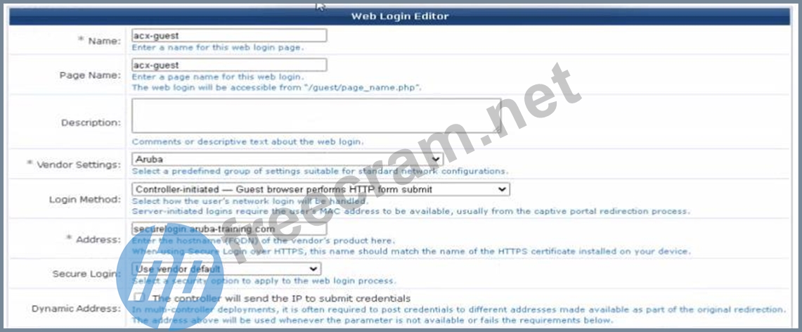The correct address for the ClearPass Guest should match the FQDN of the HTTPS certificate installed on the device, which is often the FQDN of the vendor's product. This ensures secureand proper redirection to the captive portal during the authentication process. The FQDN should be entered in the Address field for ClearPass Guest configuration.