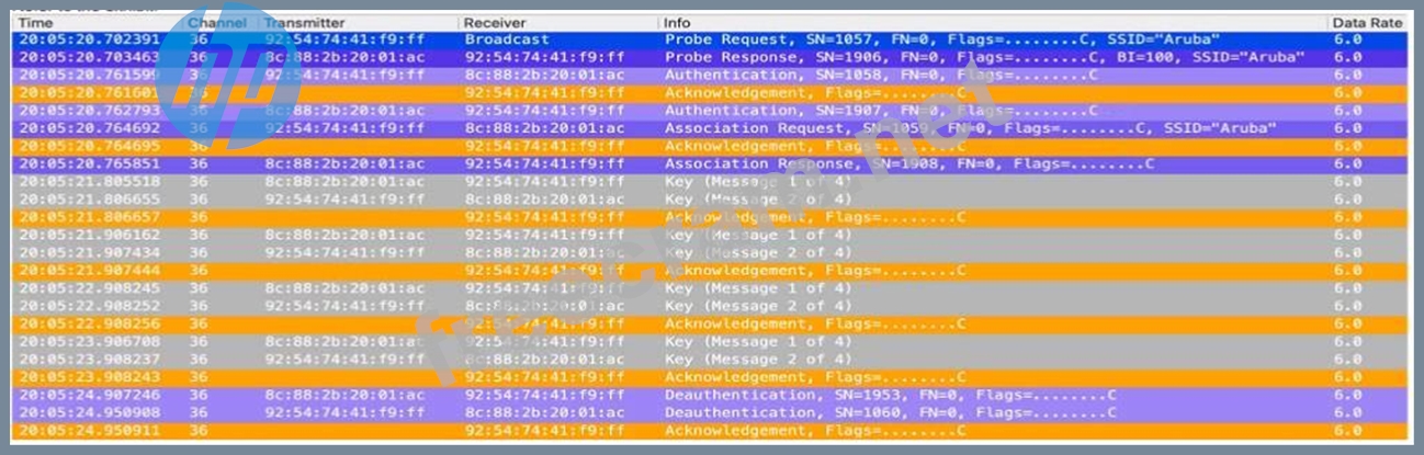 The exhibit shows a series of 802.1X authentication steps with multiple "Deauthentication" frames, which indicate that the client is not successfully completing the authentication process. Since the frames show repeated attempts at authentication followed by deauthentication, this suggests that the client is failing the 802.1X authentication process, which is required for network access in a WPA2/WPA3-Enterprise security environment.