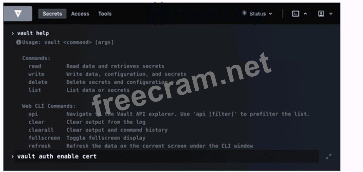 Running the second command in the GUI CLI will fail. The second command is vault kv put secret/creds passcode=my-long-passcode. This command attempts to write a secret named creds with the value passcode=my-long-passcode to the secret path, which is the default path for the kv secrets engine. However, the kv secrets engine is not enabled at the secret path, as shown by the first command vault secrets list, which lists the enabled secrets engines and their paths. The only enabled secrets engine is the transit secrets engine at the transit path. Therefore, the second command will fail with an error message saying that no secrets engine is mounted at the path secret/. To make the second command succeed, the kv secrets engine must be enabled at the secret path or another path, using the vault secrets enable command. For example, vault secrets enable - path=secret kv would enable the kv secrets engine at the secret path. References: kv - Command | Vault | HashiCorp Developer, vault secrets enable - Command | Vault | HashiCorp Developer