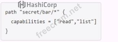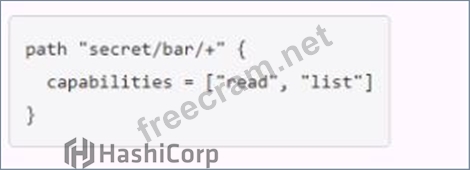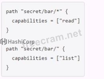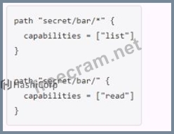 This policy would allow read permissions for all secrets at path secret/bar, as well as list permissions for the secret/bar/ path. The list permission is required to be able to see the names of the secrets under a given path1. The wildcard () character matches any number of characters within a single path segment, while the slash (/) character matches the end of the path2. Therefore, the policy would grant read access to any secret that starts with secret/bar/, such as secret/bar/foo or secret/bar/baz, but not to secret/bar itself. To grant list access to secret/bar, the policy needs to specify the exact path with a slash at the end. This policy follows the principle of least privilege, which means that it only grants the minimum permissions necessary for the users to perform their tasks3. The other options are not correct because they either grant too much or too little permissions. Option A would grant both read and list permissions to all secrets under secret/bar, which is more than what is required. Option B would grant list permissions to all secrets under secret/bar, but only read permissions to secret/bar itself, which is not what is required. Option D would use an invalid character (+) in the policy, which would cause an error. Reference: Policy Syntax | Vault | HashiCorp Developer Policy Syntax | Vault | HashiCorp Developer Policies | Vault | HashiCorp Developer