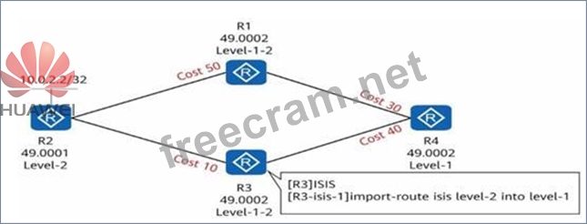 Four routers run IS-IS and have established adjacency relationship. The area number and router level are marked as shown in the figure. If route penetration is configured on the R3 device, what is the Cost value of R4 reaching 10.0.2.2/32?