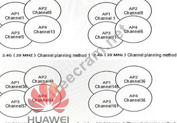 The following figure shows different channel planning methods for four APs. Which of the following options are in line with the channel planning principles and have the least interference between APs? (Multiple choice)