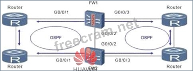 As shown in the figure, the firewall is dual-system hot standby. In this networking environment, all service interfaces of the firewall work in routing mode, and OSPF is configured on the upper and lower routers.