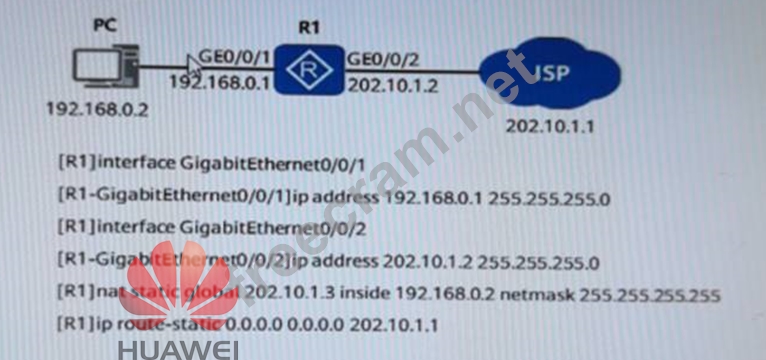 As shown in the figure, a static NAT command is deployed on router R1. When the PC accesses the Internet, the destination address in the data packet will not change.
