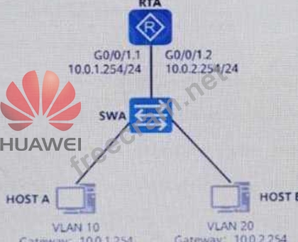 As shown in the figure, host A and host B want to implement inter-VLAN communication through single-arm routing. What configuration should be done under the G0/0/1.1 interface of RTA?()(Single-choice question)