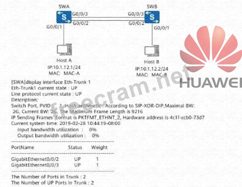 The following figure shows the display interface Eth-Trunk 1 command output on SWA. In the MAC address table of SWA, which of the following interfaces maps the MAC address of SWB?