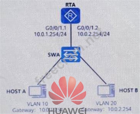 As shown in the figure, host A and host B want to implement inter-VLAN communication through single-arm routing. What configuration should be done under the G0/0/1.1 interface of RTA?()(Single-choice question)